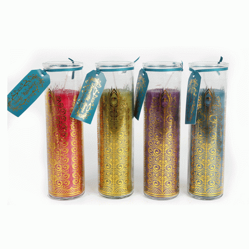 You will be sent 1 of 4 assorted colours - with each adding a beautiful flickering glow when lit. The candle pots feature beautiful gold peacock feather detailing on each, and have an impressive burn time of 25 hours. Each is tied with an exotic label that makes the candle pots a great gift idea for a loved one.