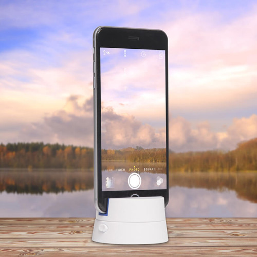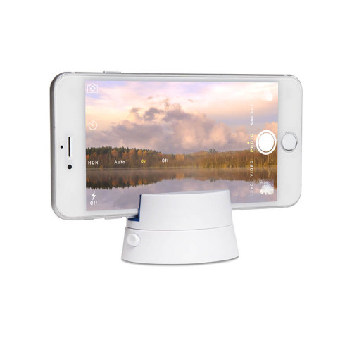 Simply place your phone in the pod holder, press the panoramic button and wind up and release the mechanism, which slowly rotates your phone in a 270-degree rotation.